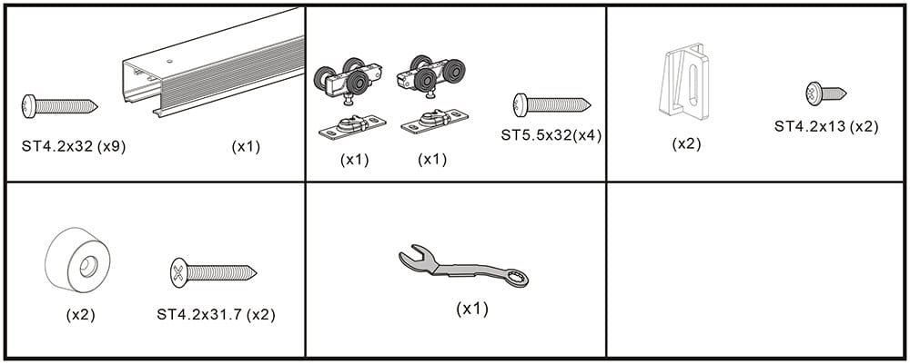 Moreover, this top-hung pocket door hardware system comes with solid nylon wheels, self-adjusting floor brackets, drywall screws, and jamb screws for effortless installation.