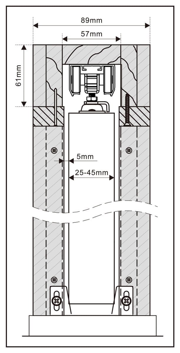 These pocket door hardware kits can accommodate doors with a thickness of 25mm (1 inch) to 45mm (1-3/4 inches) and have a maximum weight capacity of 100kg (220 lbs) and an excellent operating cycle count of 100,000.