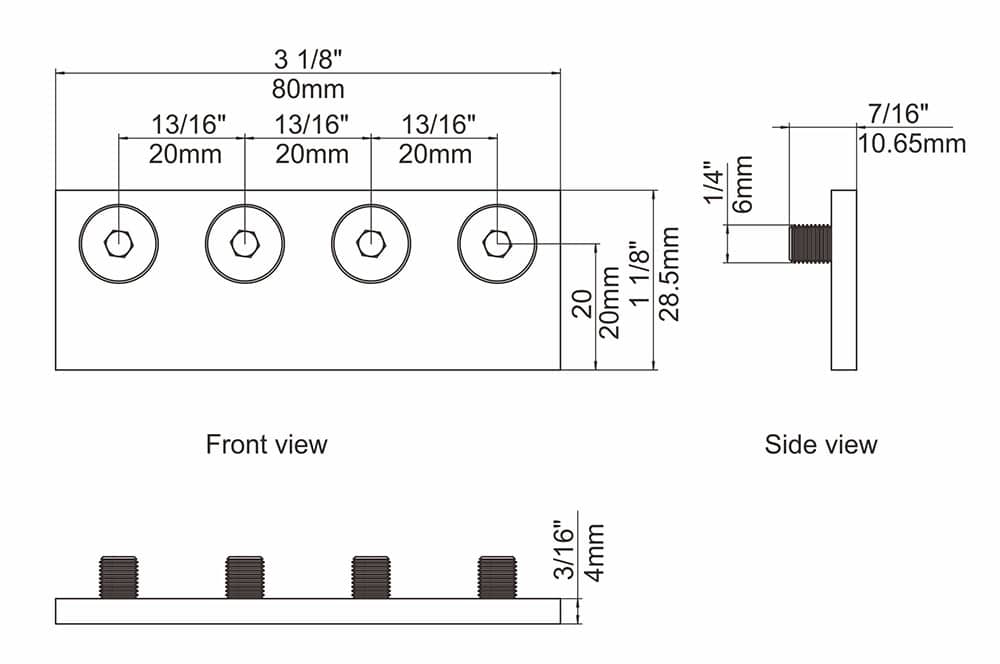 The product dimensions are 80×28.5x4mm (3-1/8 x 1-1/8 x 7/16 inches), designed to fit a rail profile size of 40x6mm.
