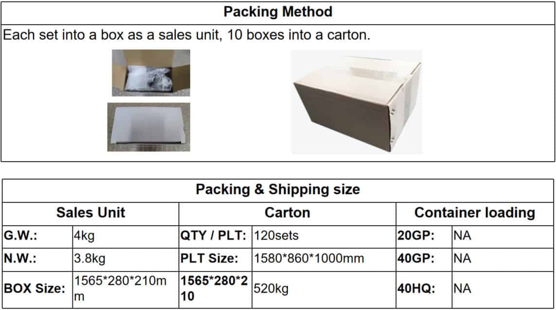 • Packing Method: Each set is packaged into a box, with 10 boxes in a carton for efficient shipping.