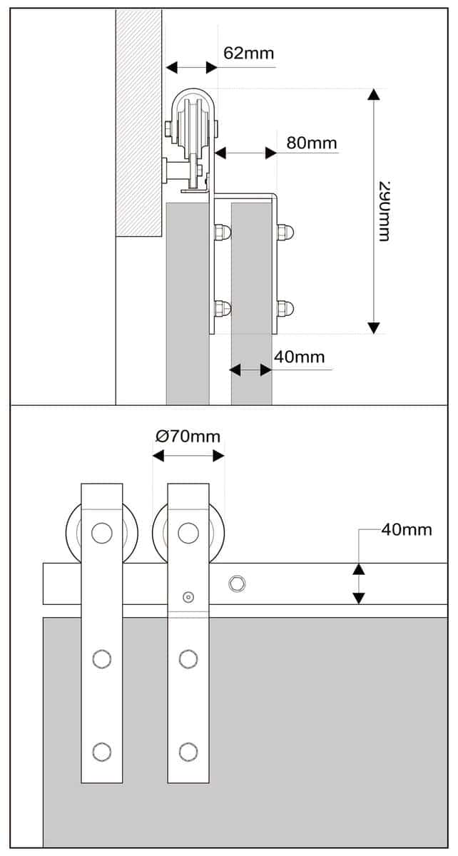 This is classic bypass barn door hardware, thanks to the unique design of the bent hanging wheel. Compared with the bypassing barn door by the brackets, this style looks simpler. The barn door was originally used as a warehouse door on the farm. It was later incorporated into interior use with an improved design.