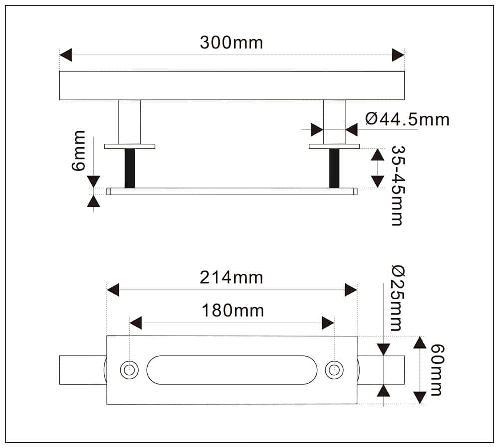 This black barn door handle has a total length of 300mm (11.8 inches), a hole center distance of 180mm (7 inches), and a pipe profile diameter of 25mm (1 inch). Its functional and adaptable design includes an H-shaped handle on one side and a finger pull on the other.